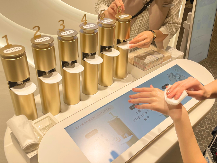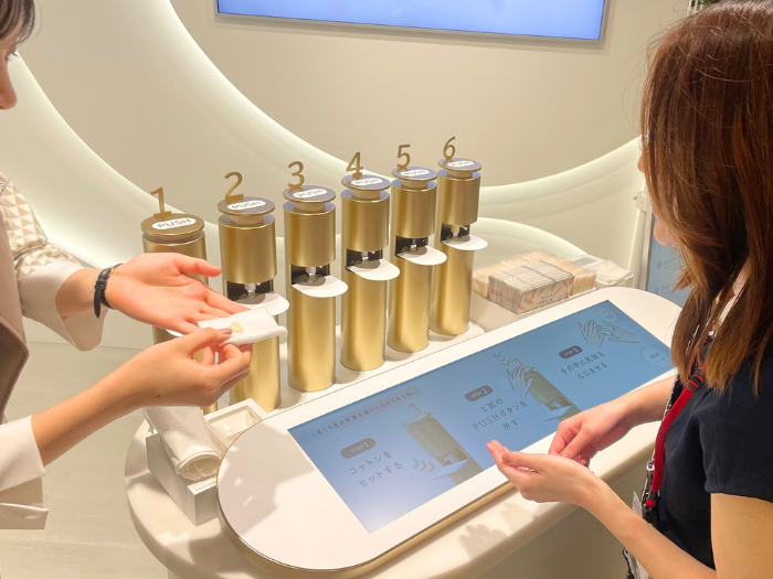 高輪店では、アルビオンの象徴的アイテムである「乳液」をその場で体験できる「6つの乳液体験サービス」が受けられるのが魅力です。