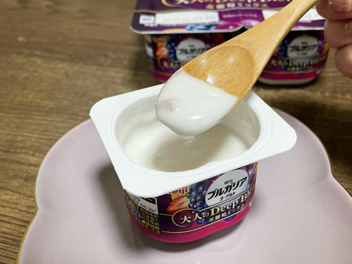 「大人のDeep Blend 赤葡萄ミックス」は、赤ワインにも使用される品種を使った葡萄果汁(カベルネソーヴィニヨン、コンコード)をメインにりんご・いちご果肉、オレンジ果汁をブレンド。渋みと深みが感じられるヨーグルト。