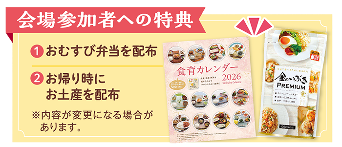 会場ではおむすび弁当を配布いたします。また、学んだことをすぐ実践できる「食育カレンダー」や「金のいぶき PREMIUM」をおみやげとしてプレゼント。