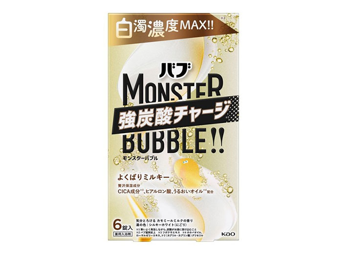 「バブ モンスターバブル よくばりミルキー」は、花王の炭酸ガスの薬用入浴剤「バブ モンスターバブル」シリーズから登場した新商品。バブ錠剤史上「白濁濃度MAX」で、「強炭酸(勢いよく発泡すること)」なのが特徴。気分贅沢なミルキーバスを楽しみながら、温浴効果を高め、疲労回復をサポート。70gのBIG(比較対象:バブゆずの香り)タブレットが勢いよく発泡し、1日の疲れをじんわりほぐしてリラックス気分へ。CICA成分(ツボクサエキス)やヒアルロン酸、うるおいオイル※などの贅沢保湿成分も配合。シルキーホワイトのお湯と、気分とろけるカモミールミルクの香りで、毎日のバスタイムがご褒美時間に。