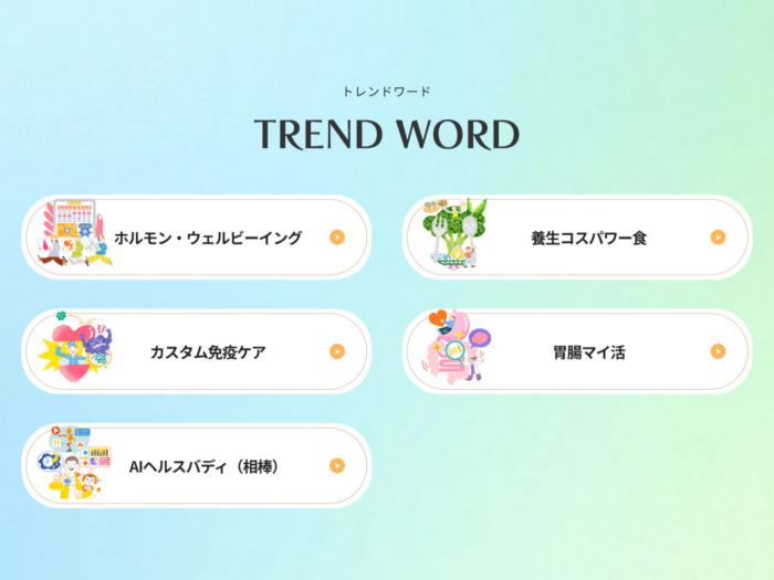 「ホルモン・ウェルビーイング」「養生コスパワー食」「カスタム免疫ケア」「胃腸マイ活」「AIヘルスバディ(相棒)」の5つです。