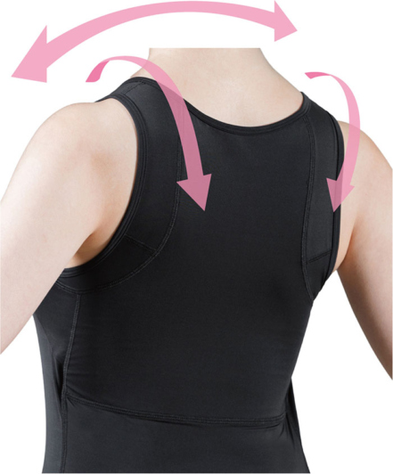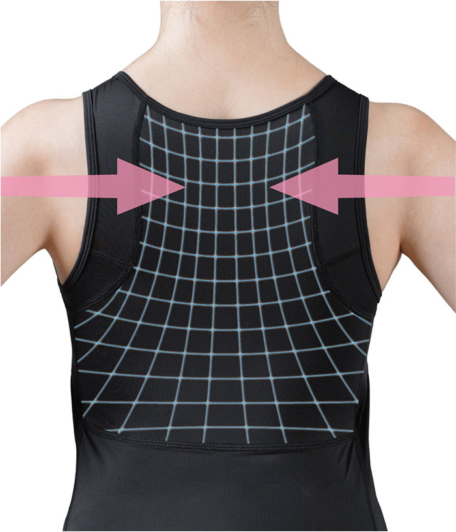 背面の肩甲骨周りには、2層構造のパワーネットがより広く配置されています。このネットが肩甲骨を内側に引き寄せ、肩周りを本来の正しい位置へと戻します。伸縮性のある生地を重ねることで、強力なサポート力がありながら、心地よい着用感を実現しています。