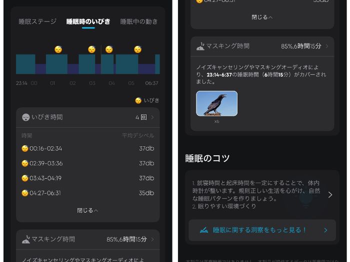 アプリの履歴を確認すると、ある夜、私の睡眠中には平均35~37dbほどのいびきが4回検知されていました。