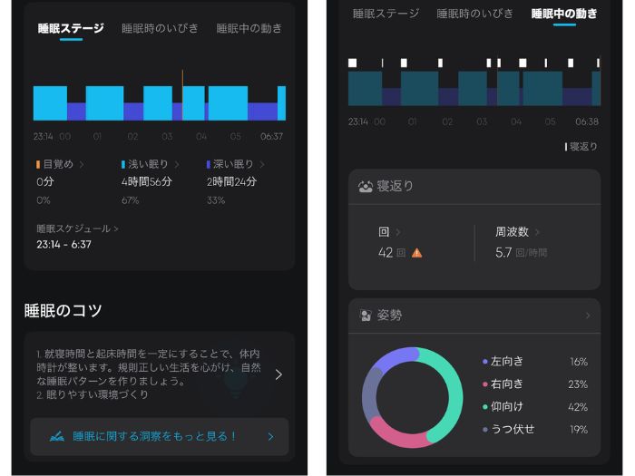 朝起きた後のお楽しみが、アプリでの「睡眠レポート」の確認です。 Sleep A30は、入眠時間や睡眠時間だけでなく、寝返りのタイミングや姿勢、さらには「深い眠り」と「浅い眠り」の割合まで詳しく記録してくれます。